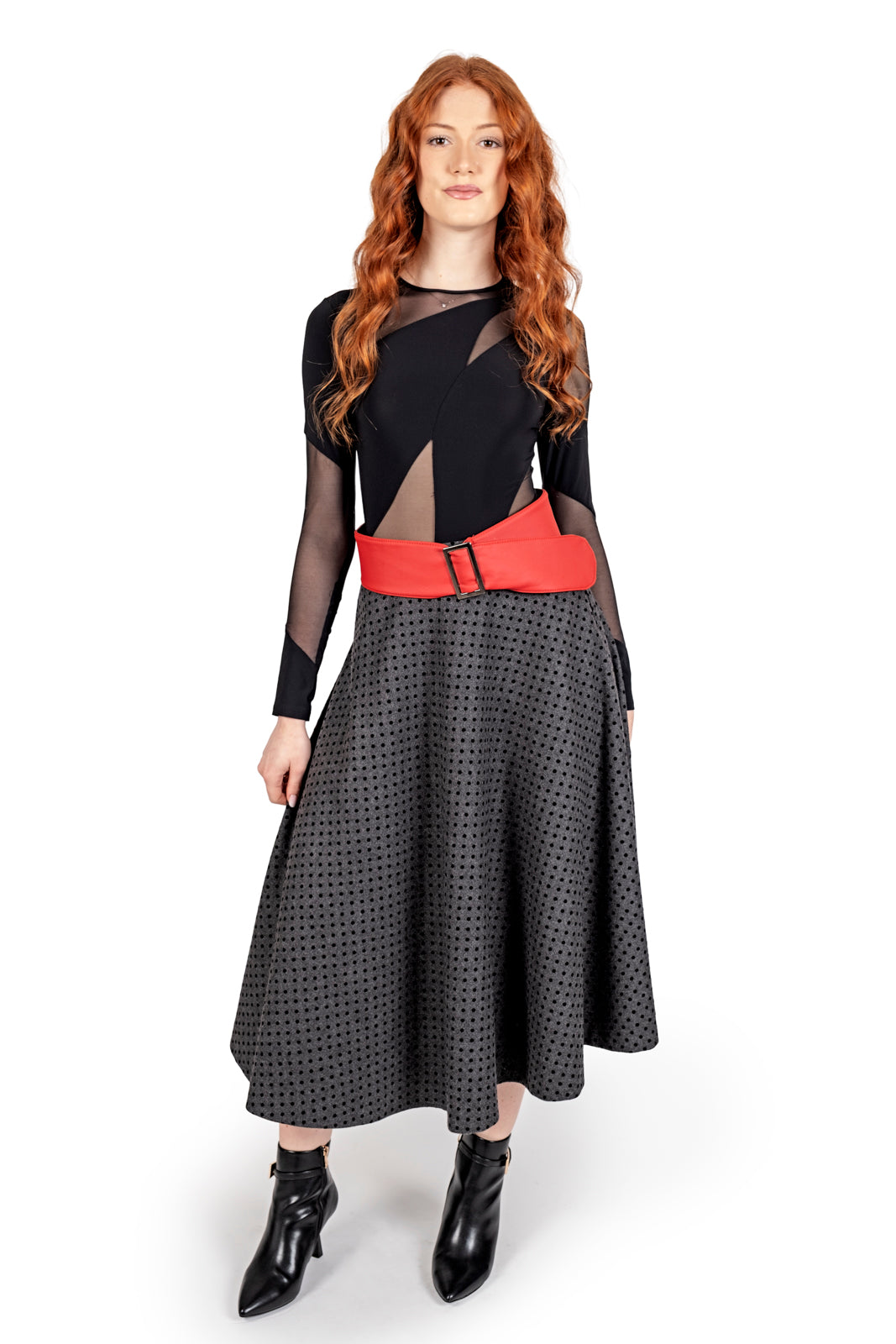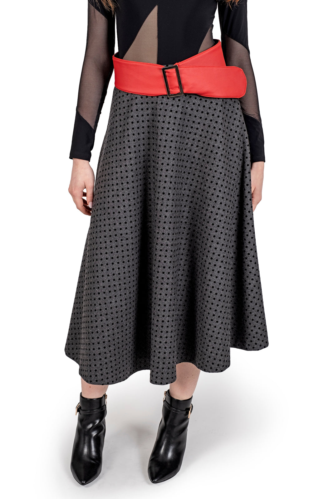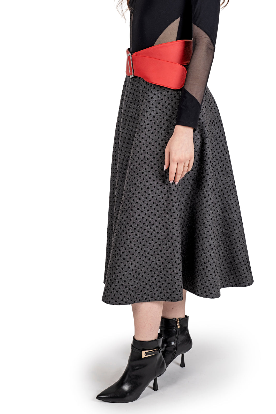 Taglio sartoriale circolare che crea un volume naturale e scenografico, la vita è enfatizzata da una maxi cintura asimmetrica in rosso scarlatto, che spezza il rigore del grigio e diventa il punto focale dell'intero outfit. (possibilità di essere indossata anche senza cintura).