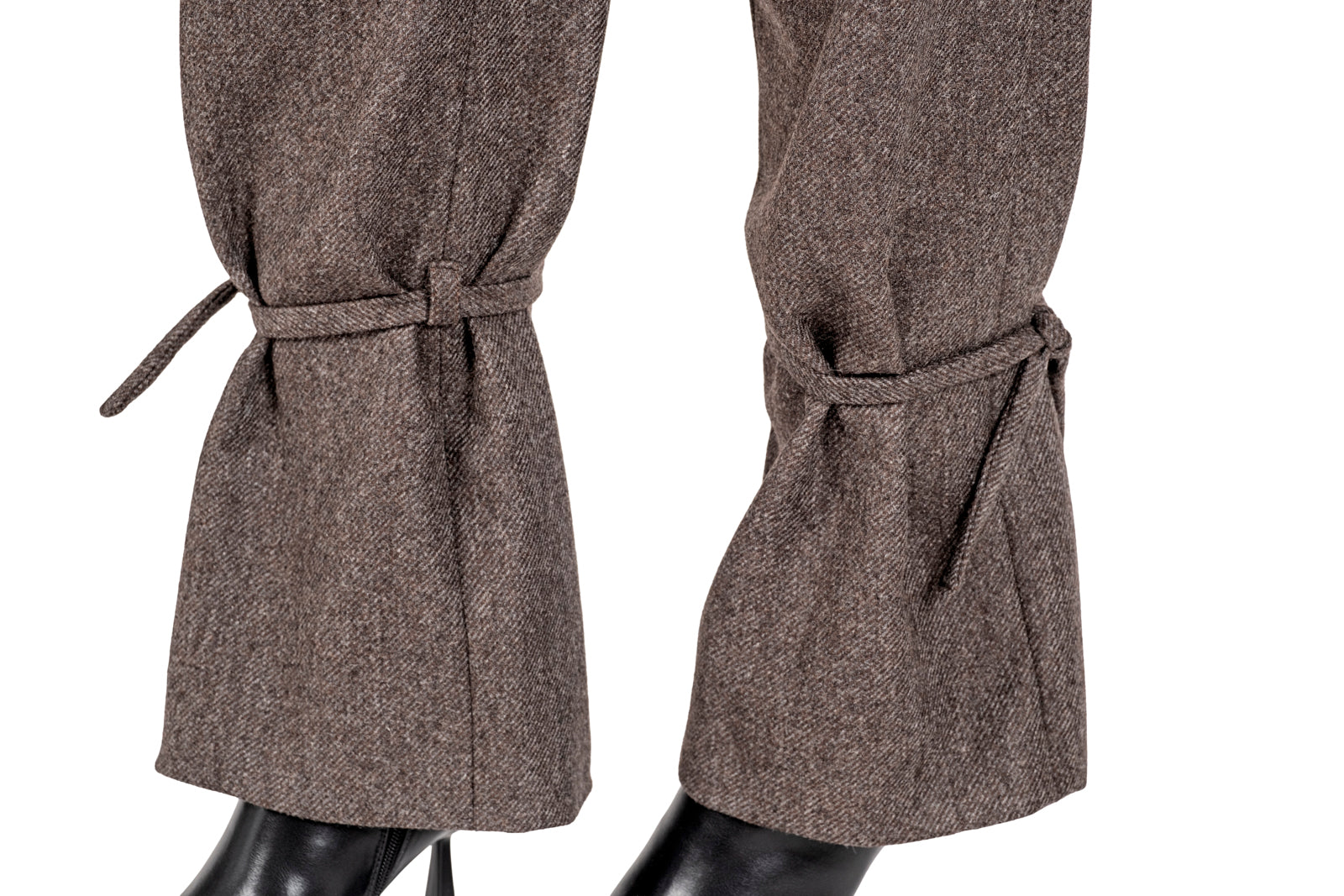 Pantalone Lantern in lana, realizzato in un raffinato tessuto mélange color fango, questo pantalone presenta una piega sul davanti un taglio ampio che si stringe alla caviglia con un elegante laccio coordinato, creando l'iconico effetto a lanterna.