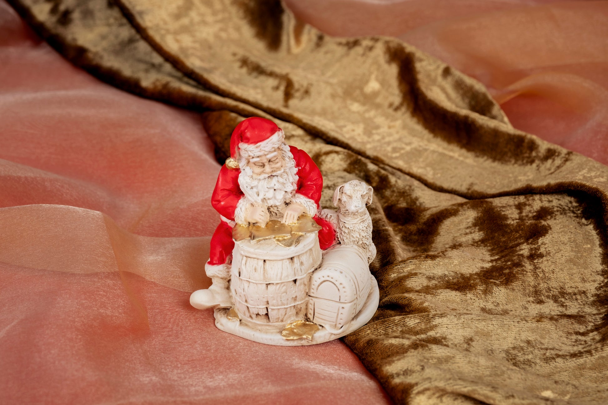 Piccolo Babbo Natale con barile in polvere di marmo, dipinto a mano.