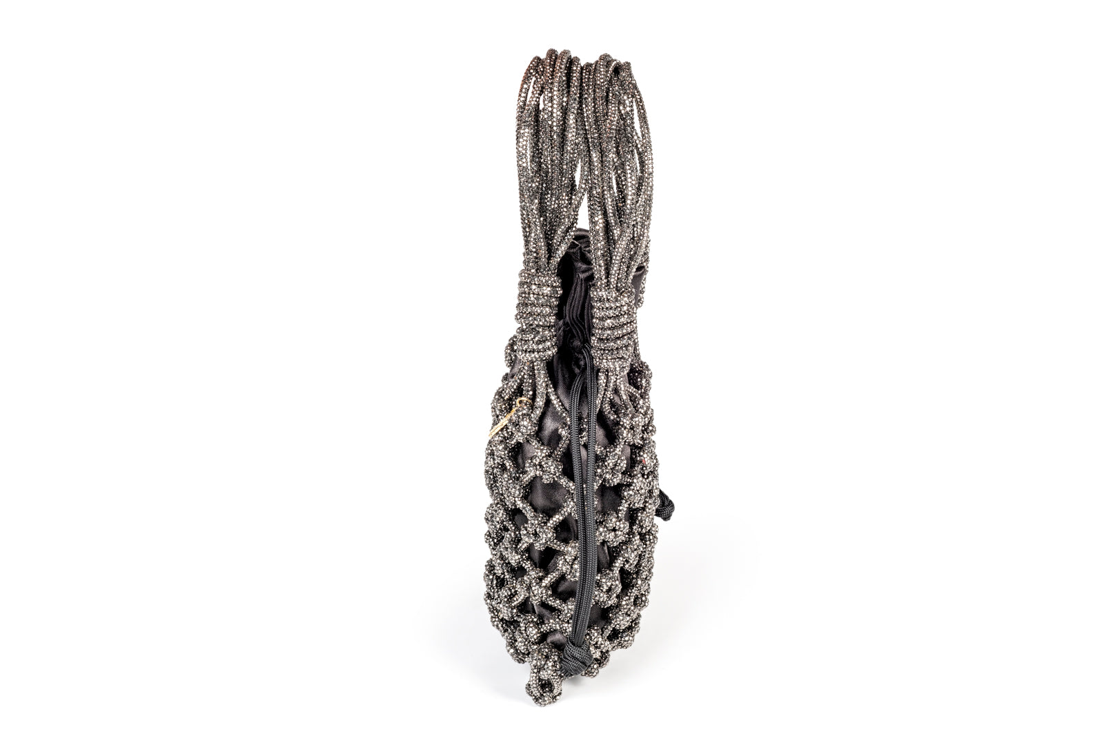 Piccola e raffinata borsa in macramè con cordino strass e sacchettino in raso estraibile, perfetta per serate ed eventi o per dare un tocco unico al tuo look quotidiano.