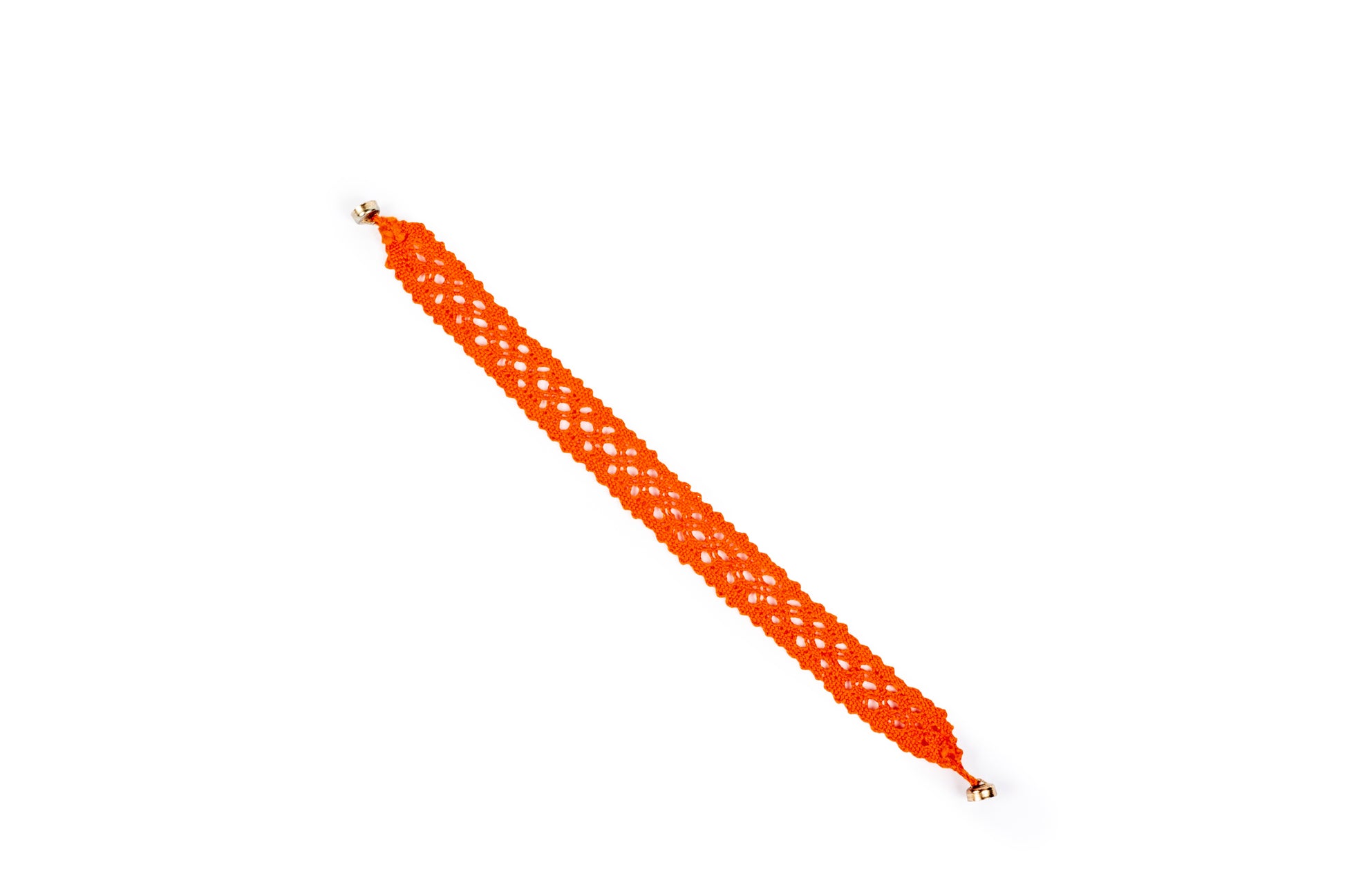 Bracciale in merletto a tombolo a fascia in cotone colore arancio, con chiusura a magnete.