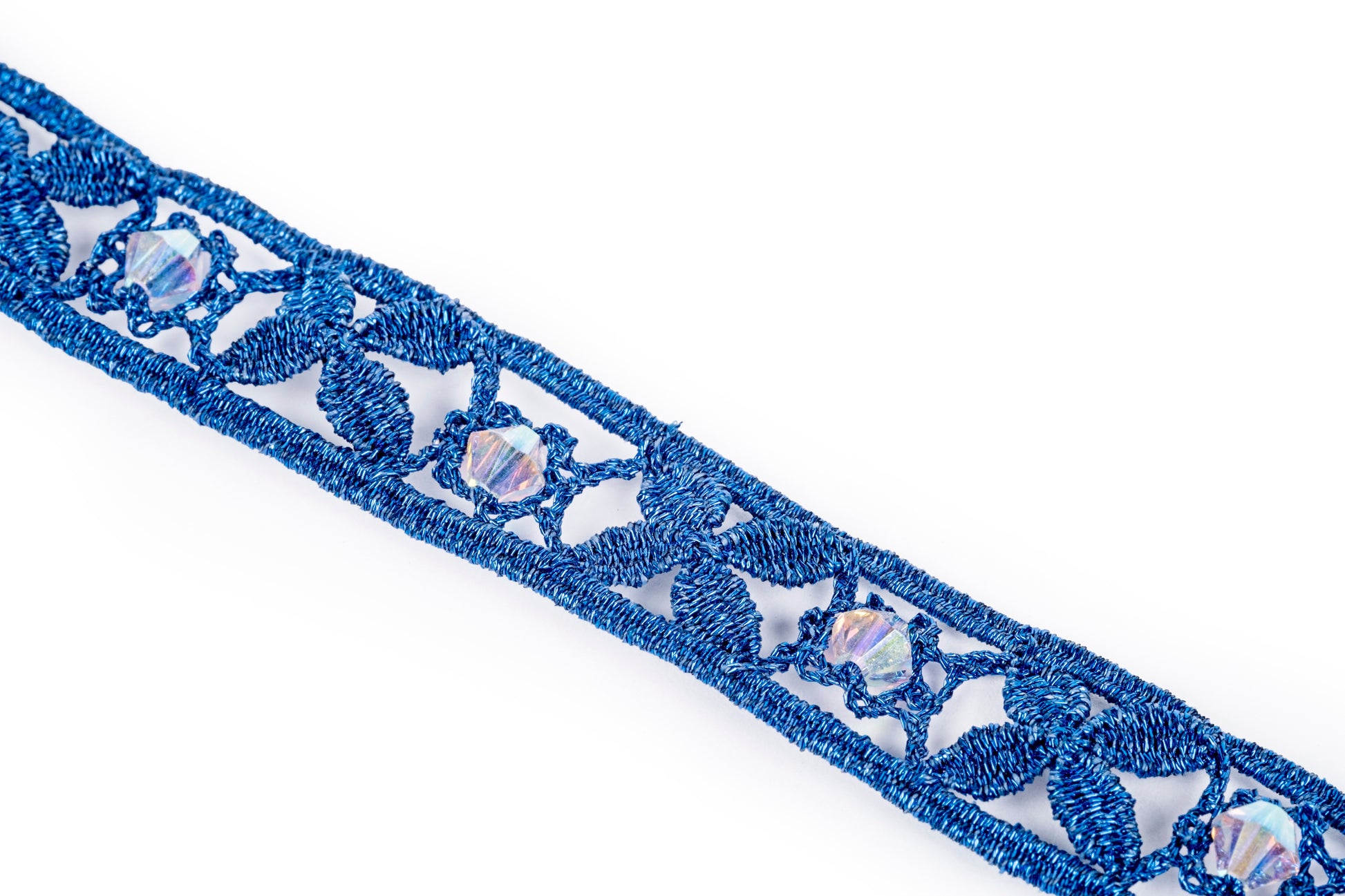 Bracciale in merletto a tombolo a fascia colore blu metallizzato, con cristalli e punti luce termoadesivi.