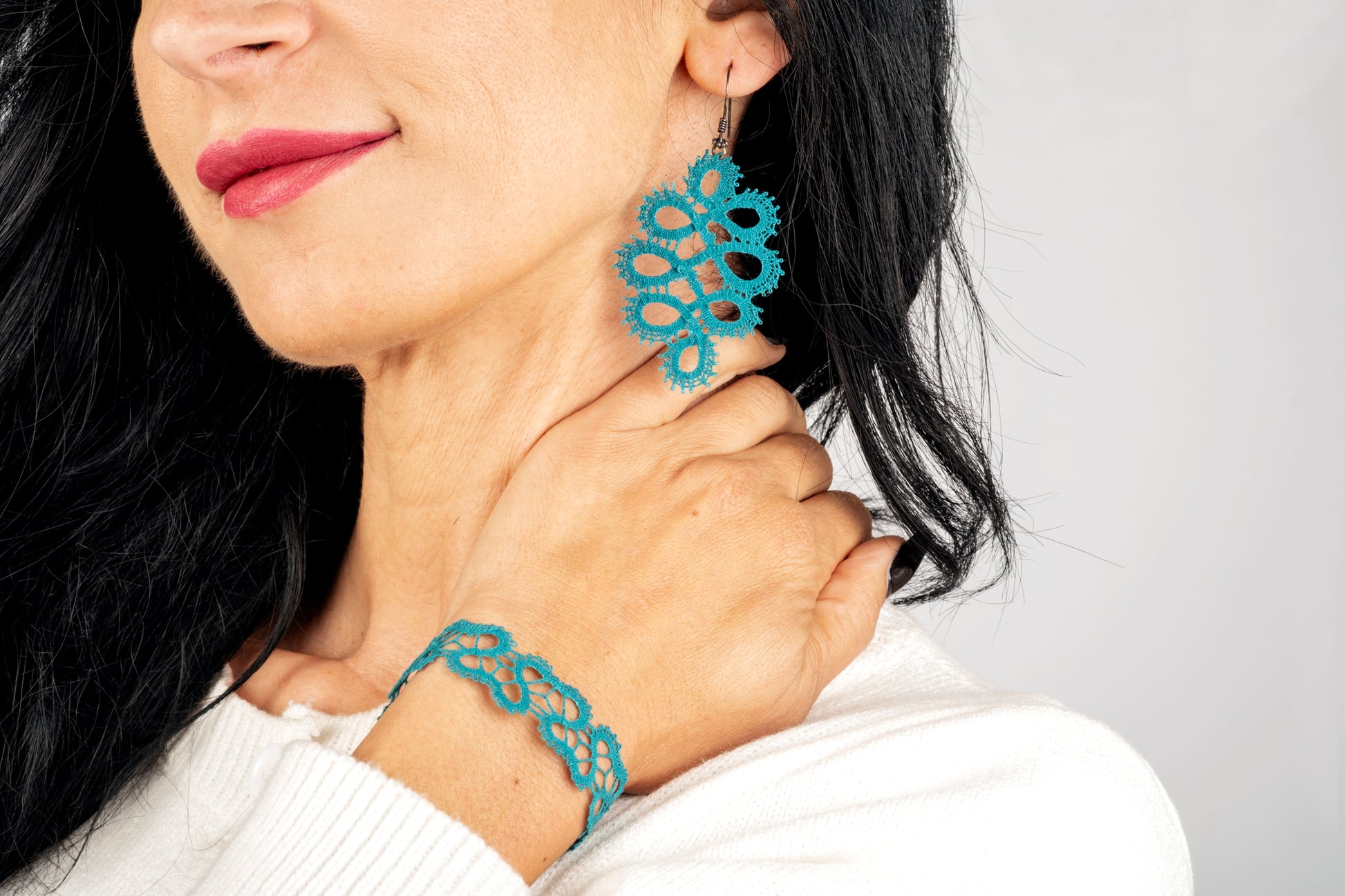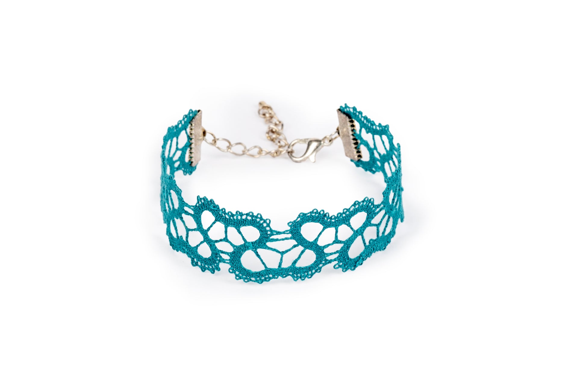 Bracciale in merletto a tombolo a fascia color ottanio.