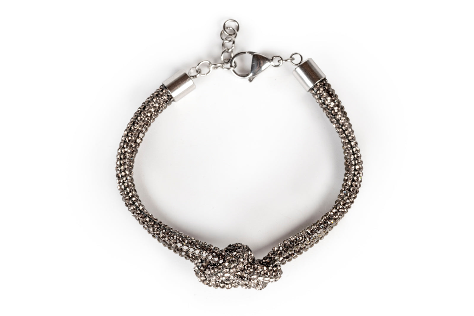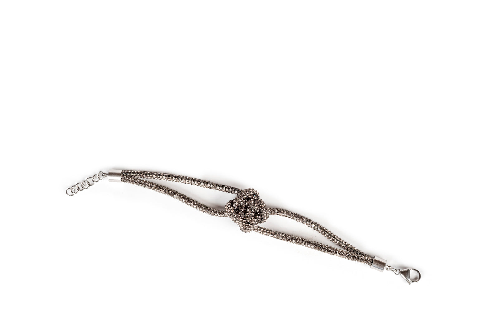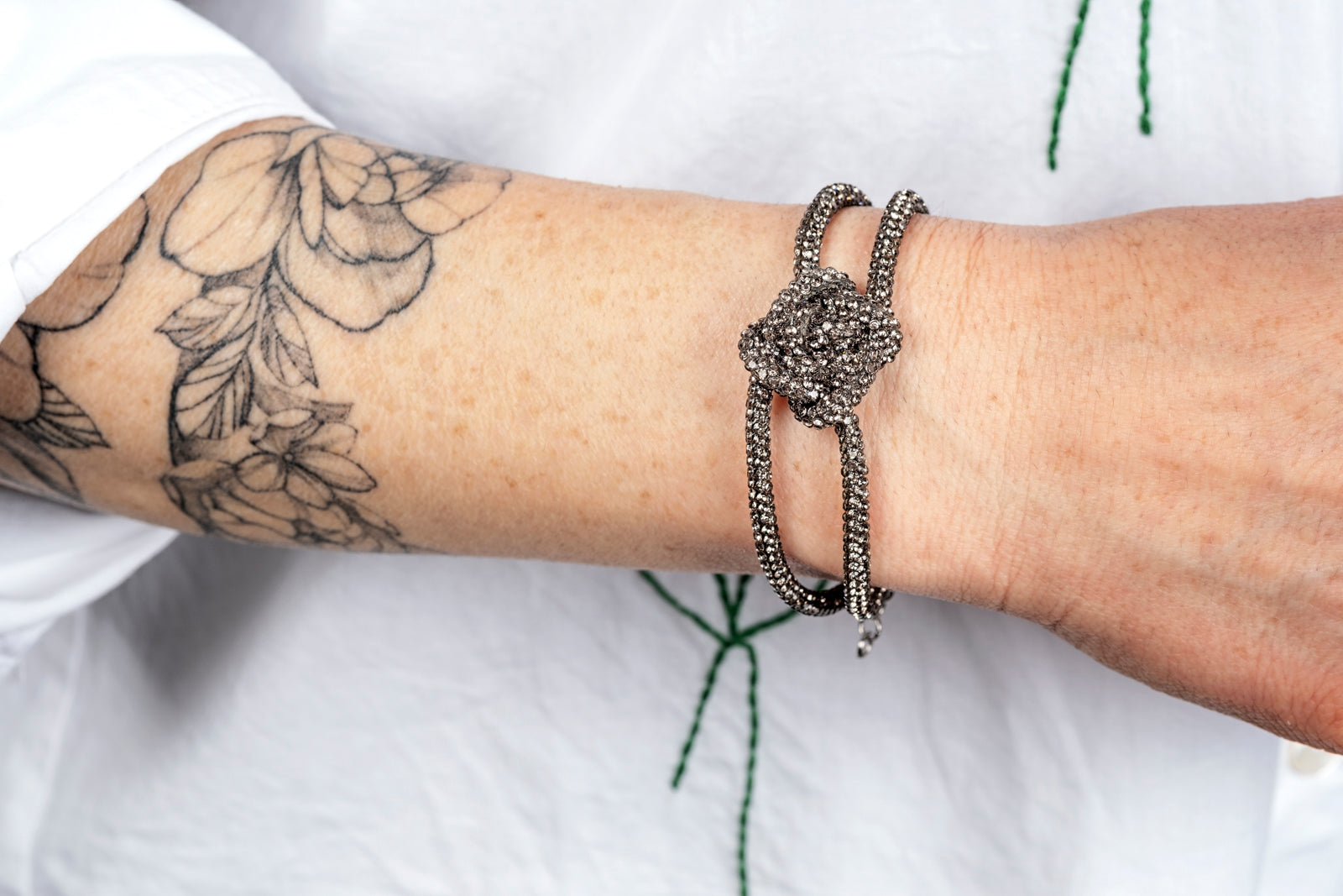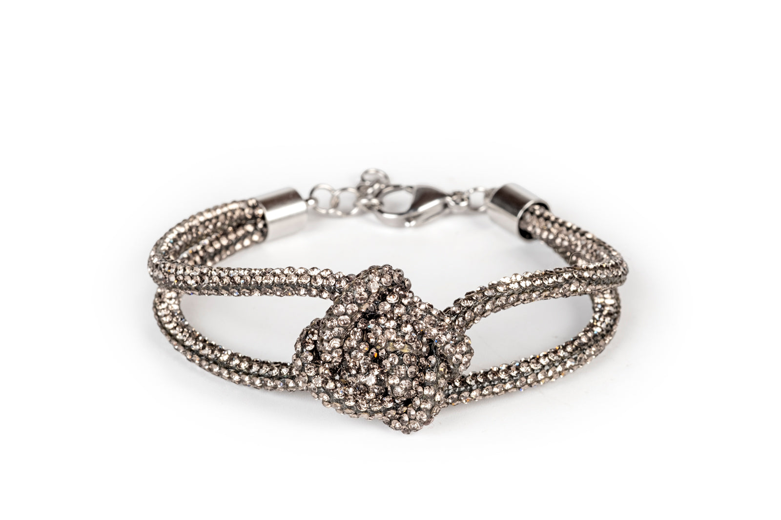 Braccialetto in strass con intreccio a fiore, regolabile.