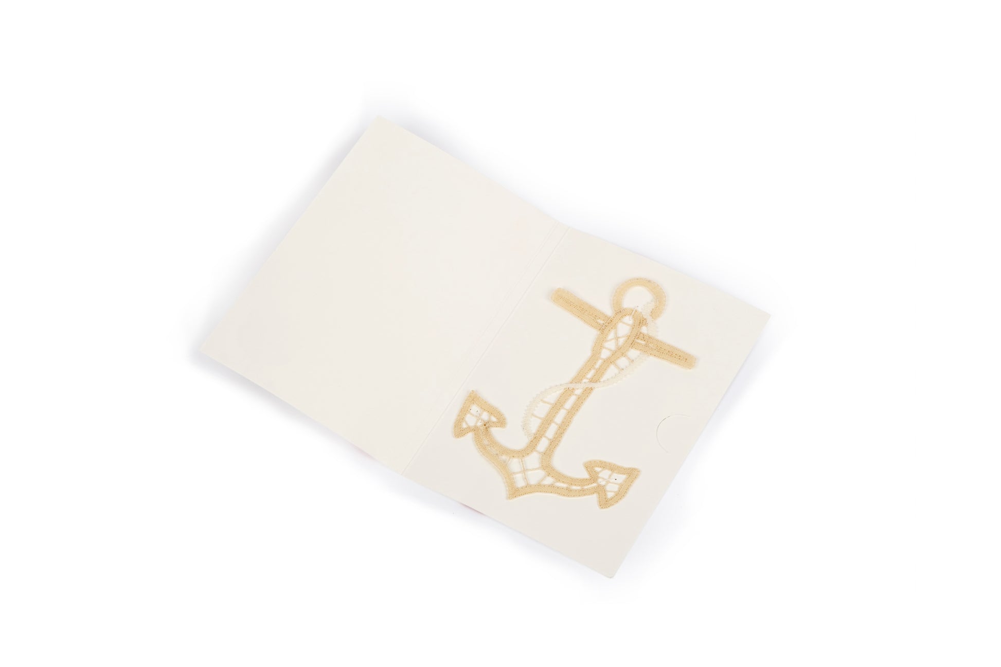 Decorazione a forma di ancora in merletto a tombolo, applicabile su tessuti o da incorniciare.