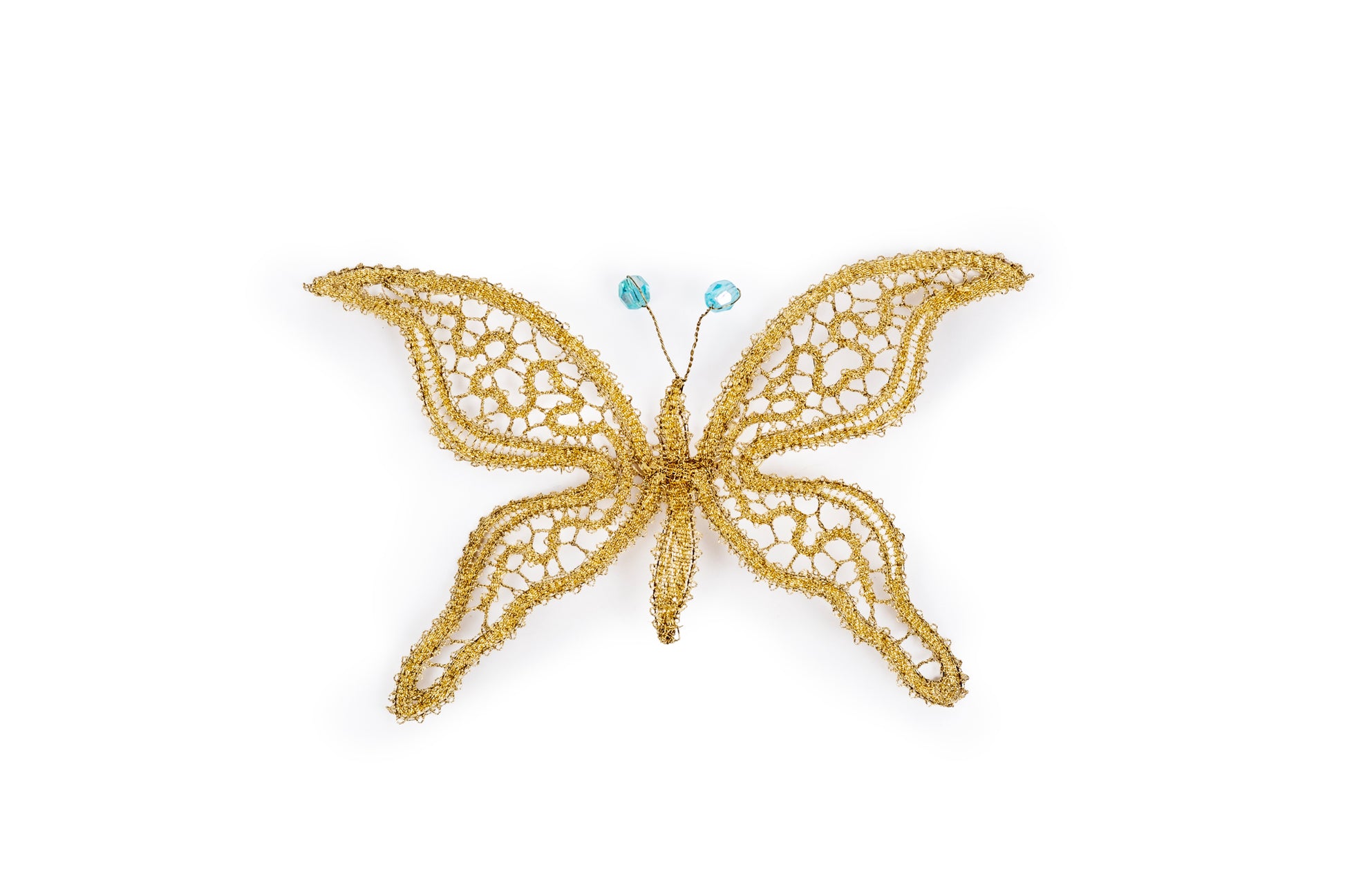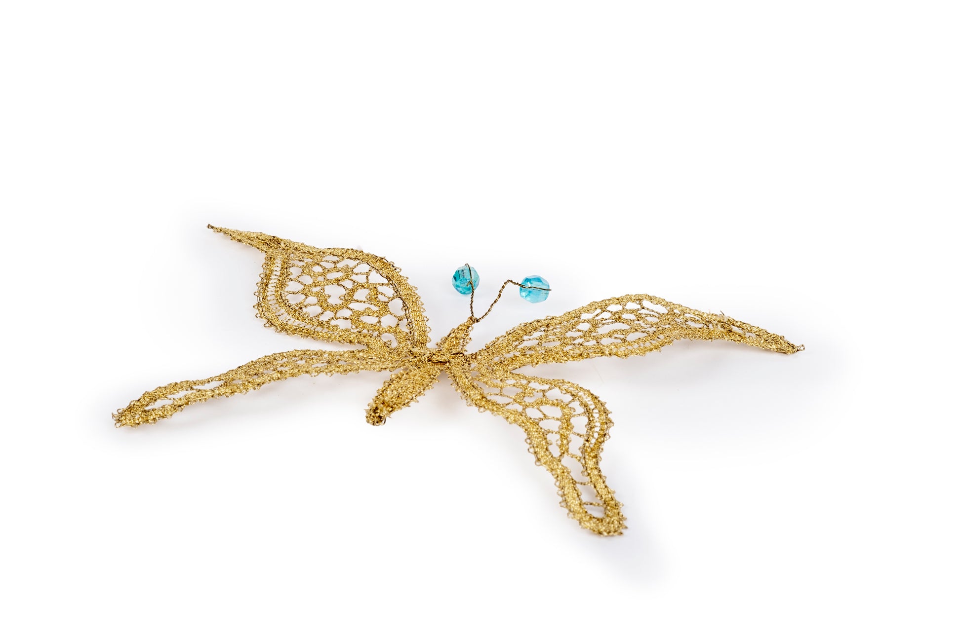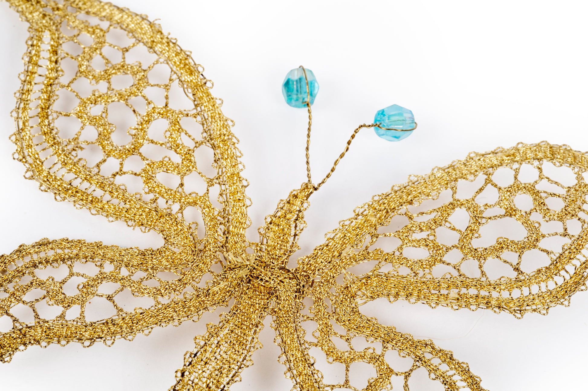 Decorazione farfalla in merletto in filo metallico color oro, con perline turchesi.