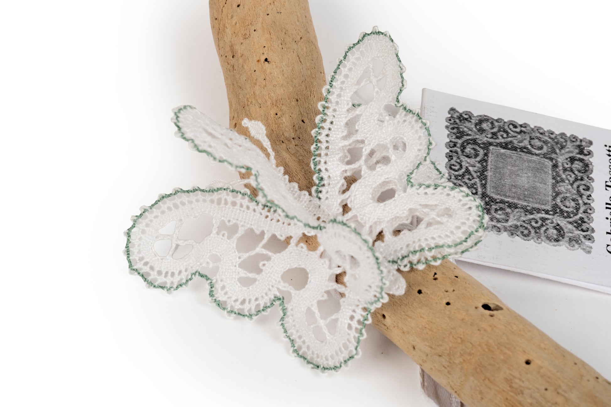 Segnaposto, decorazione per bomboniera, in merletto a tombolo di colore bianco con profilo verde, con nastrino di raso bianco.