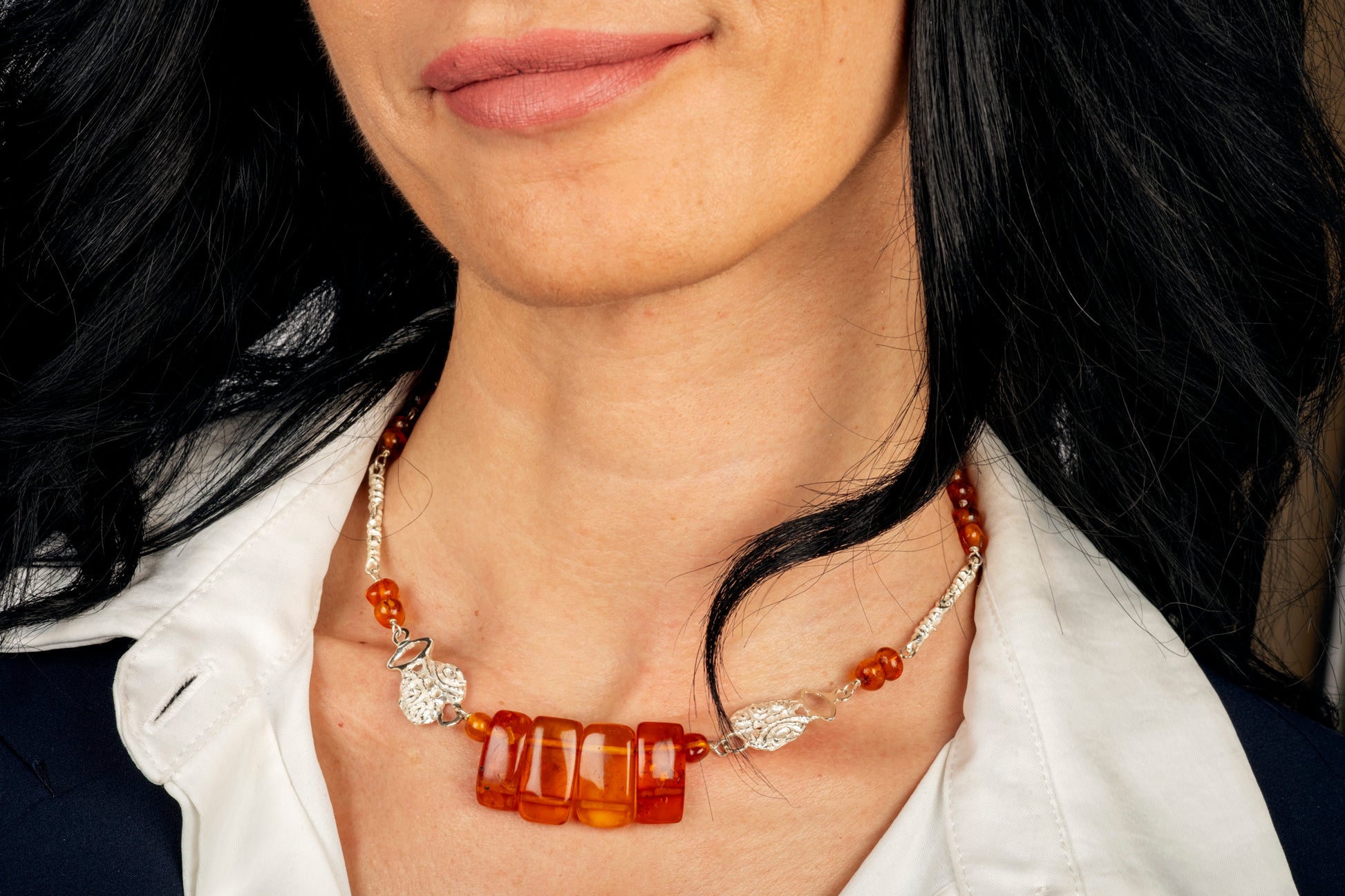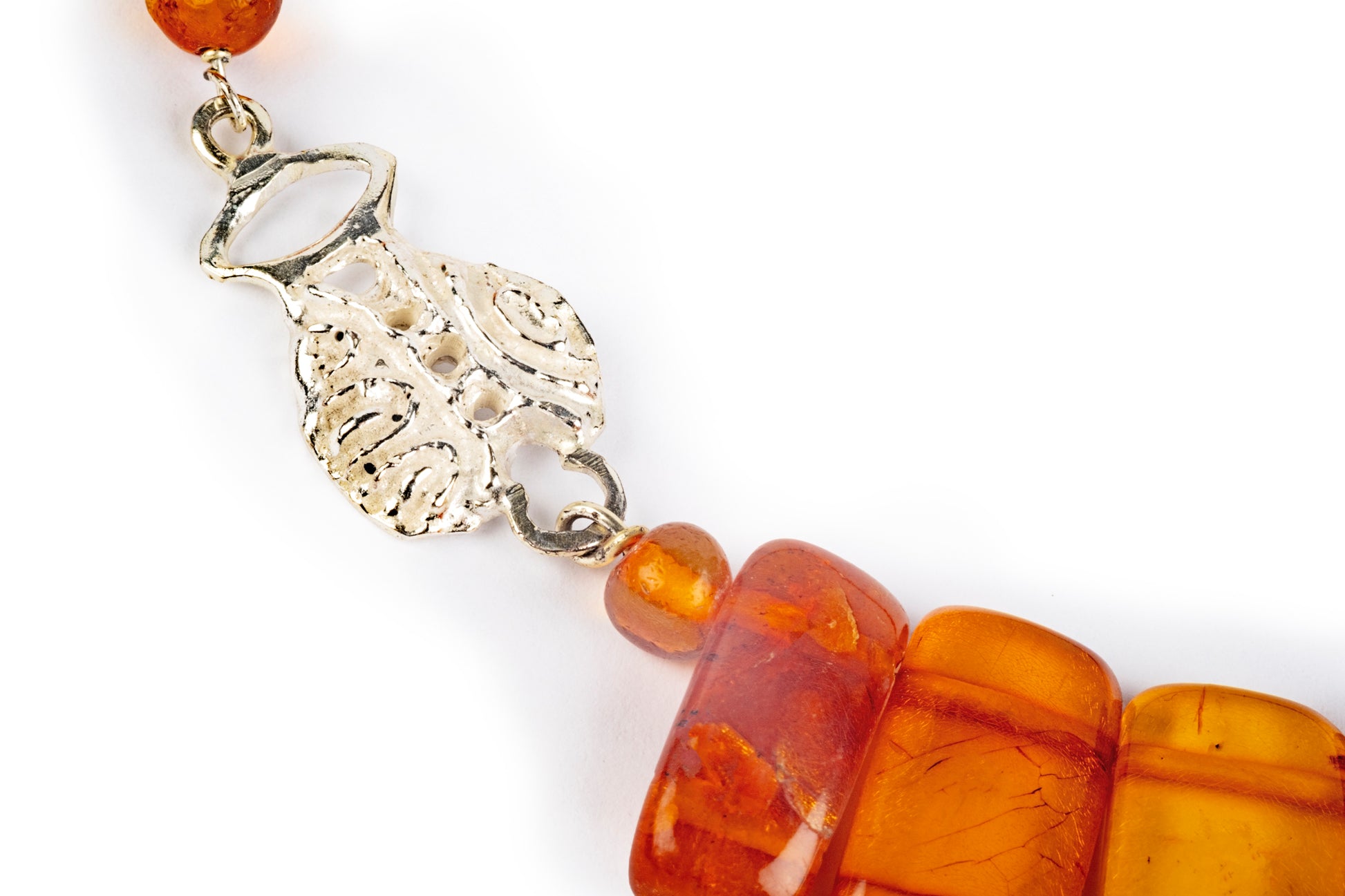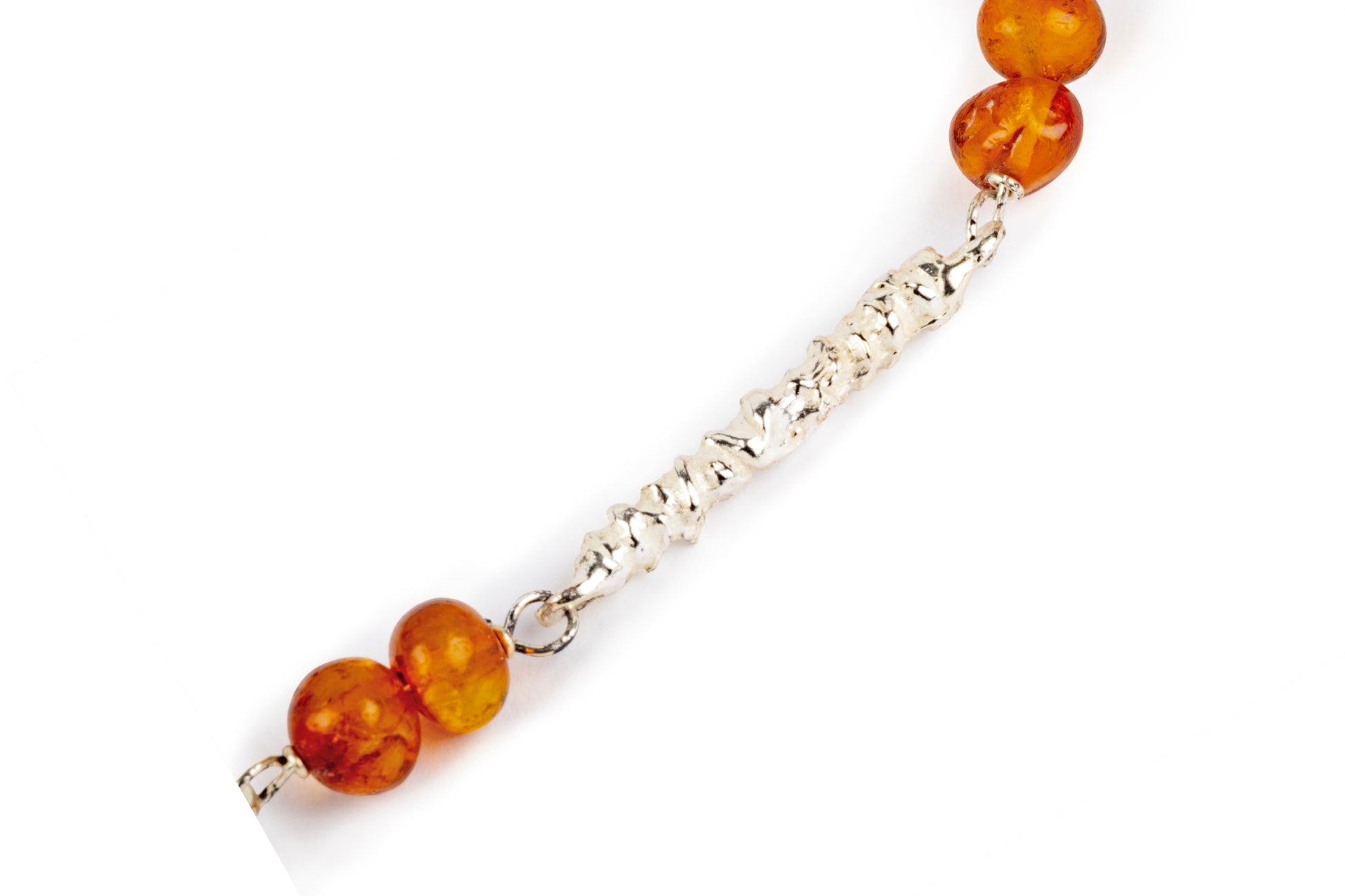 Girocollo in argento realizzato in microfusione a cera persa, con ambra naturale a palline e rettangoli.