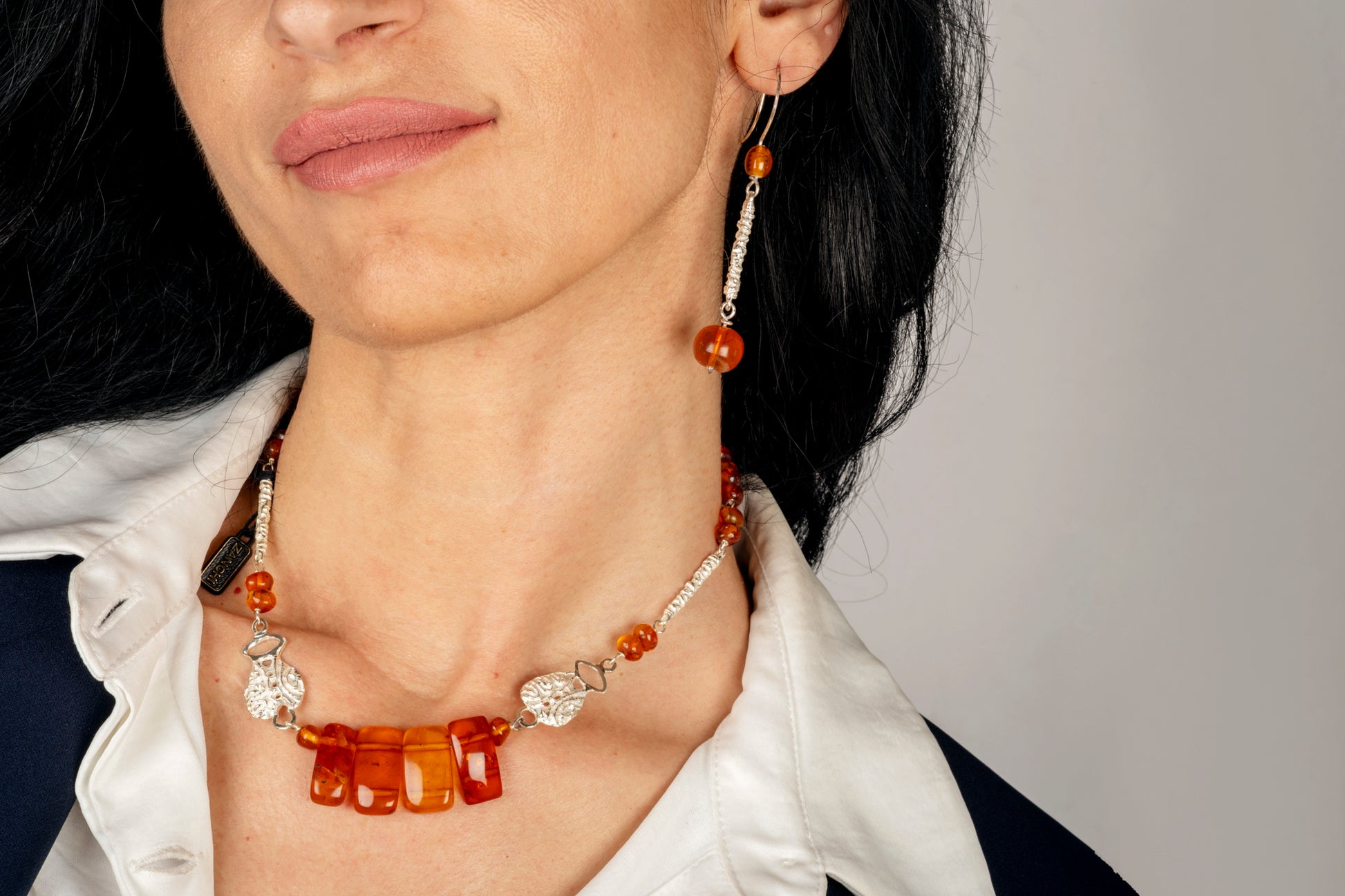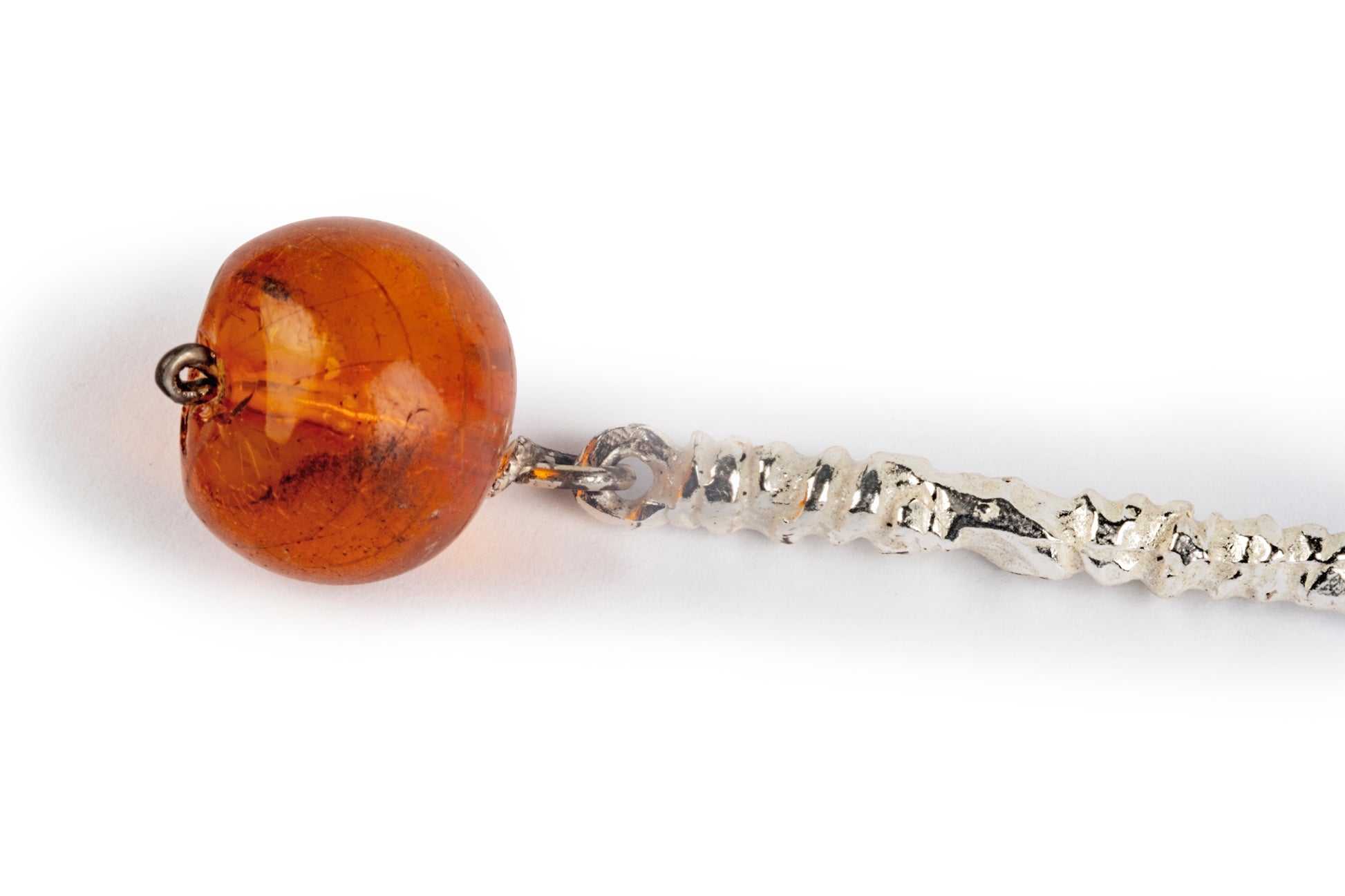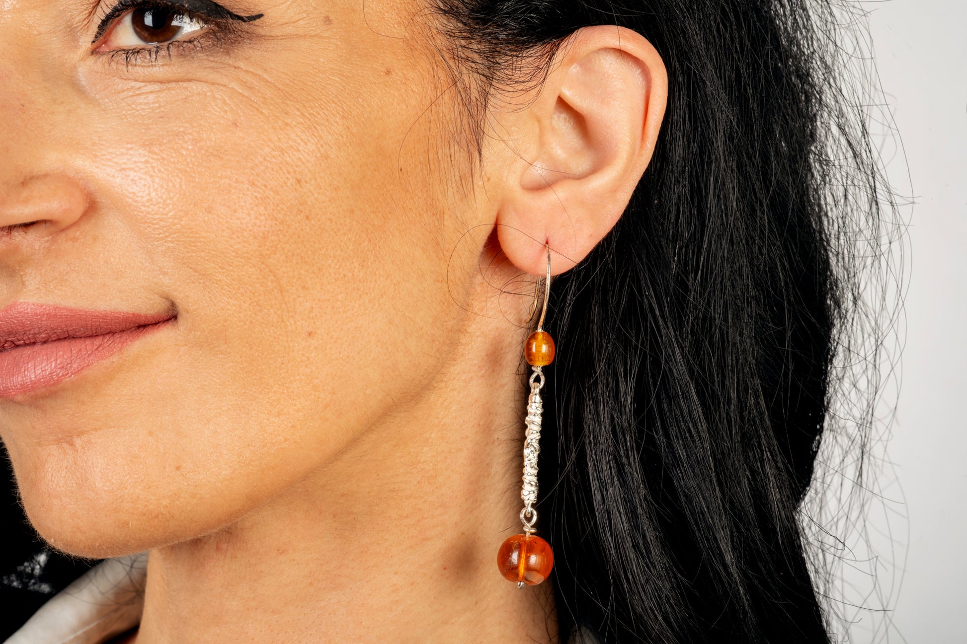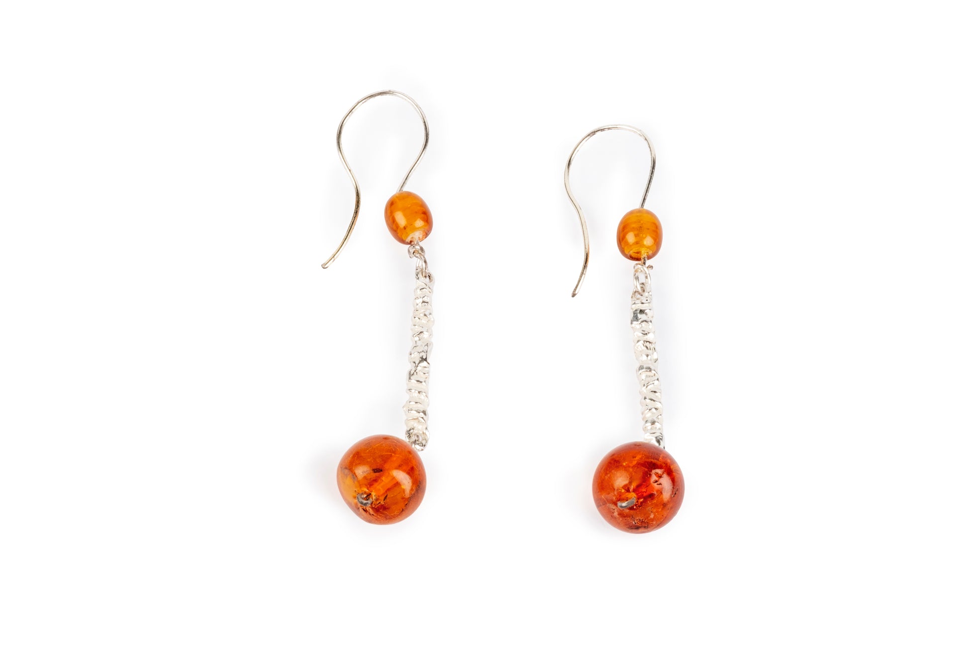 Orecchini in argento realizzati in microfusione a cera persa, con ambra a palline.