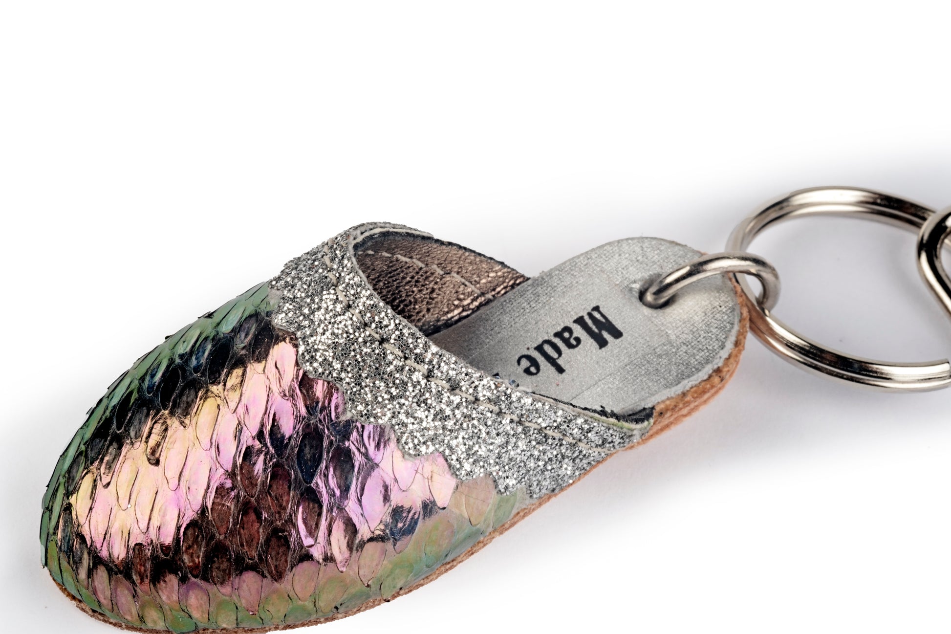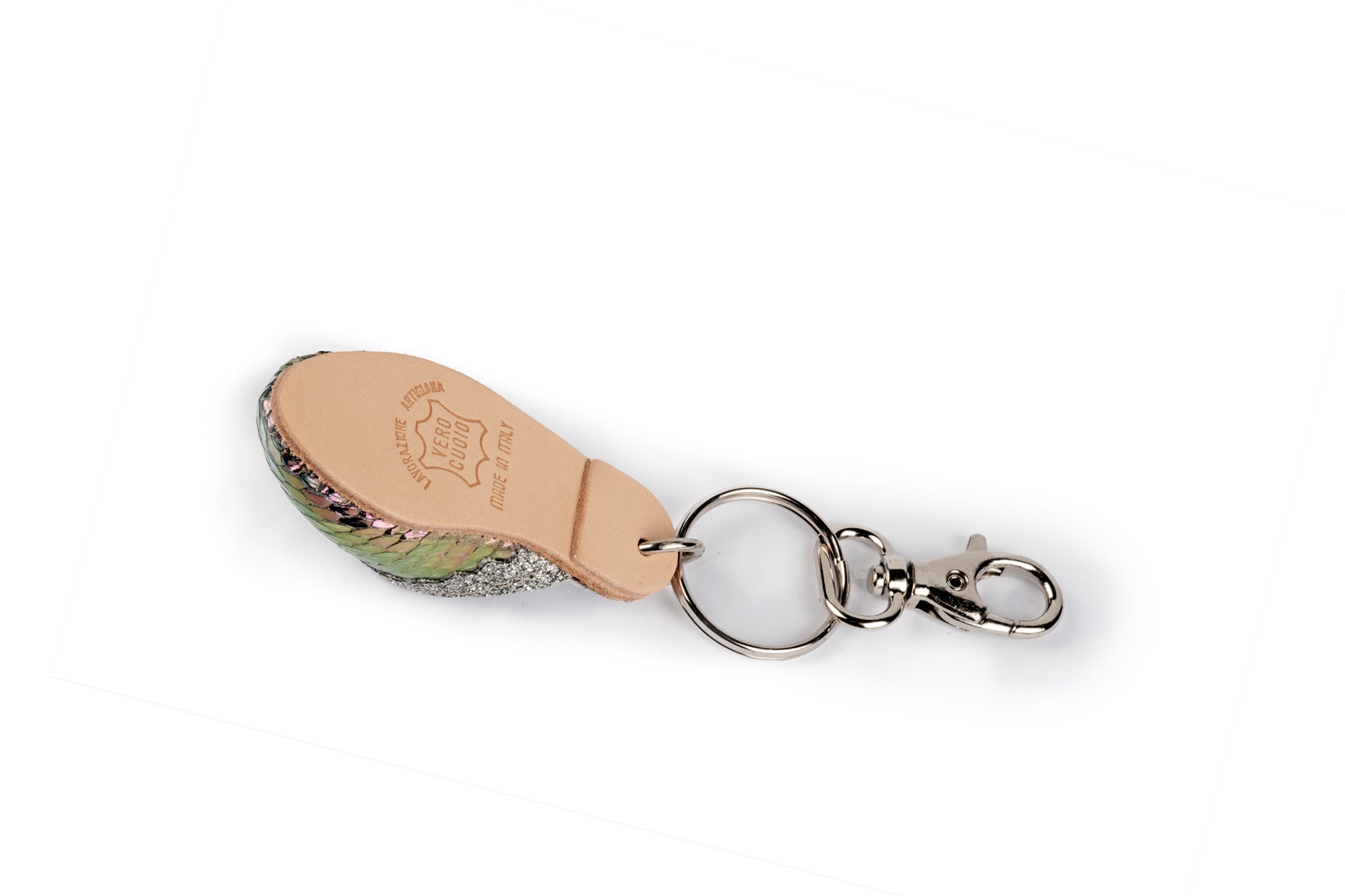 Portachiavi ciabattina in pelle con riflessi cangianti sui toni del rosa e verde acqua.