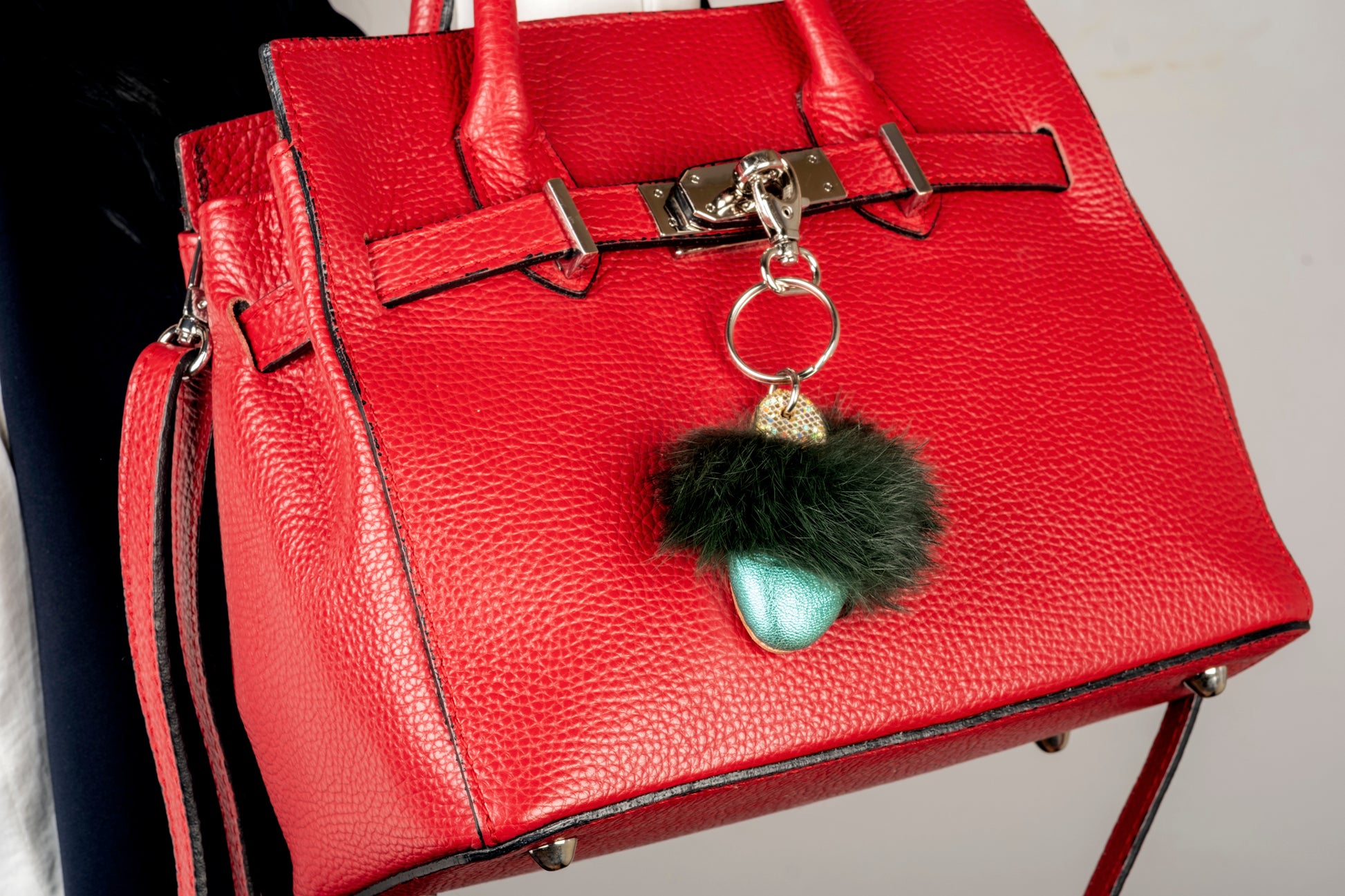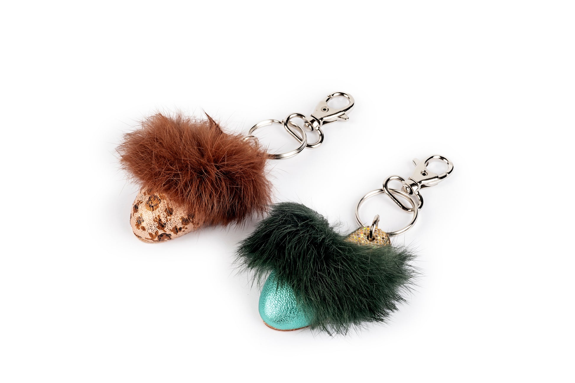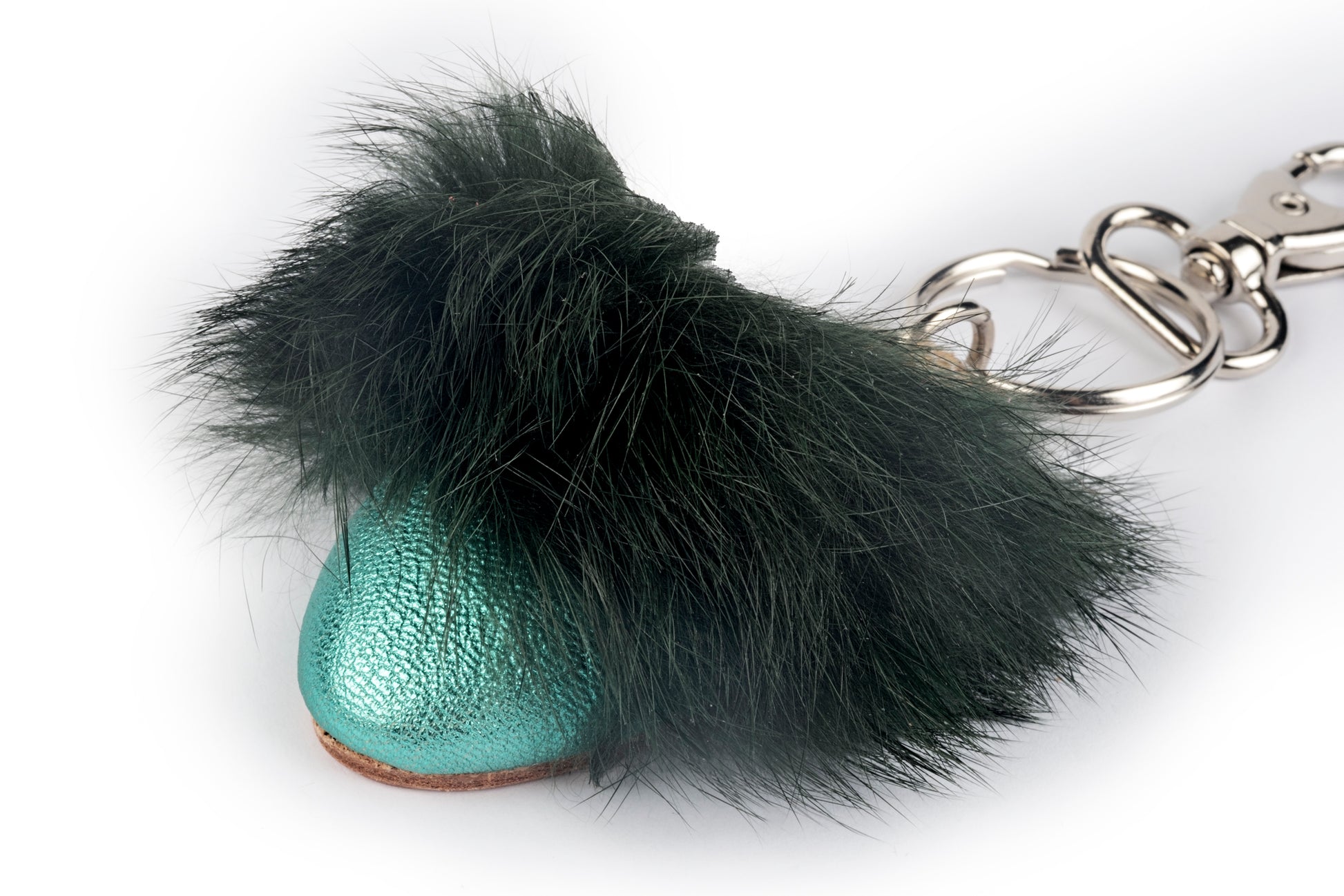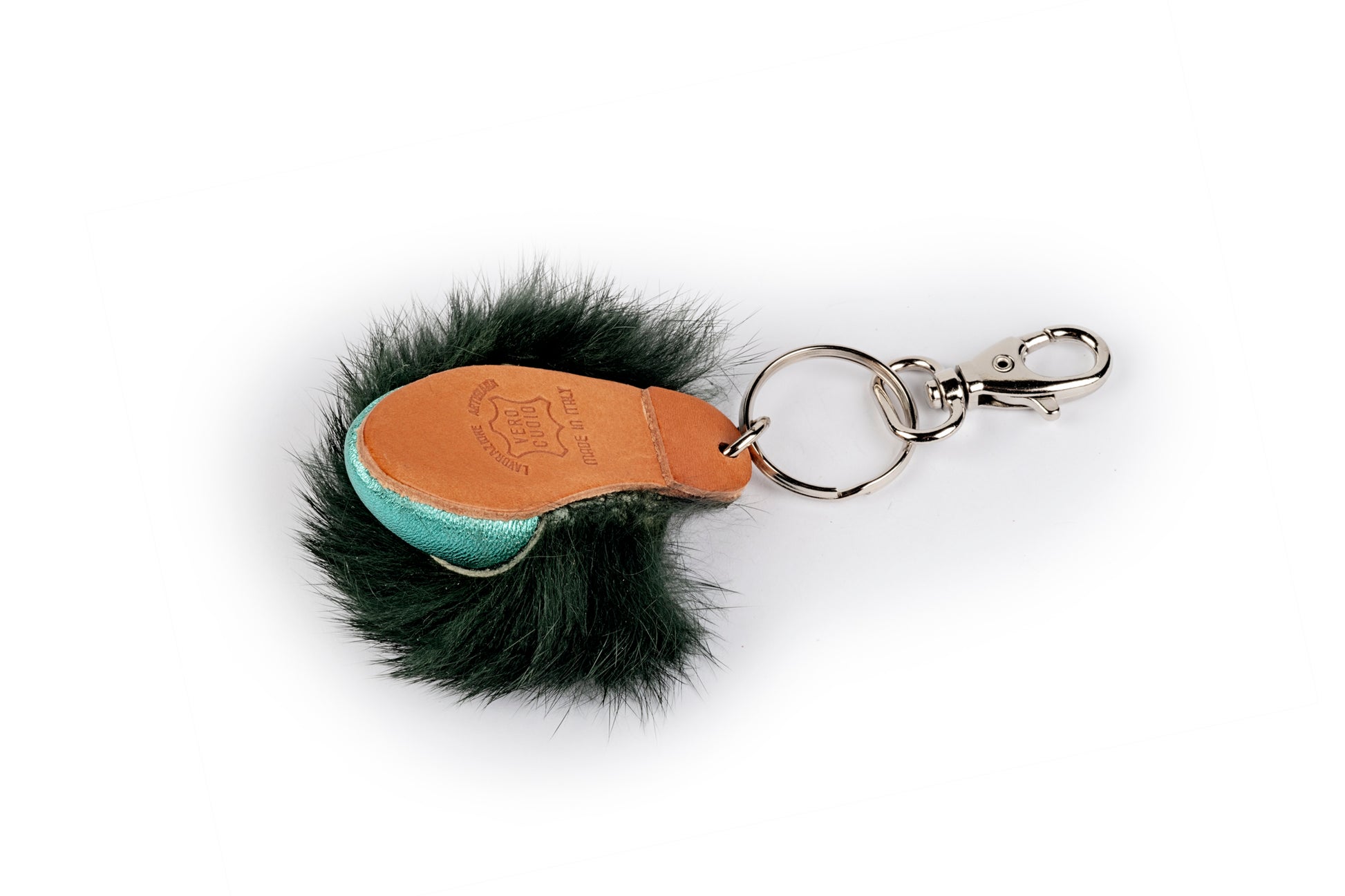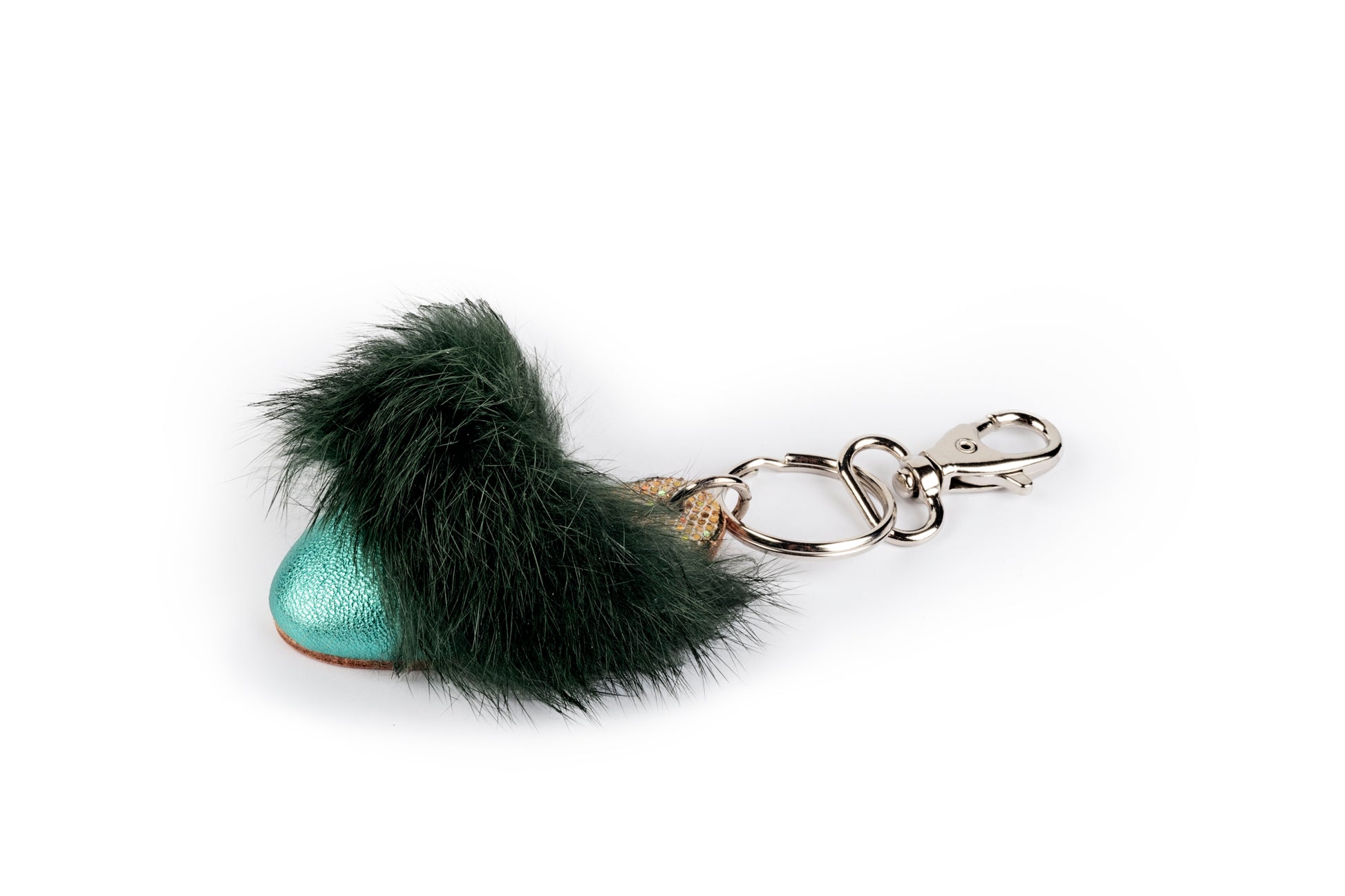 Portachiavi ciabattina verde acqua in pelle con pelliccia verde