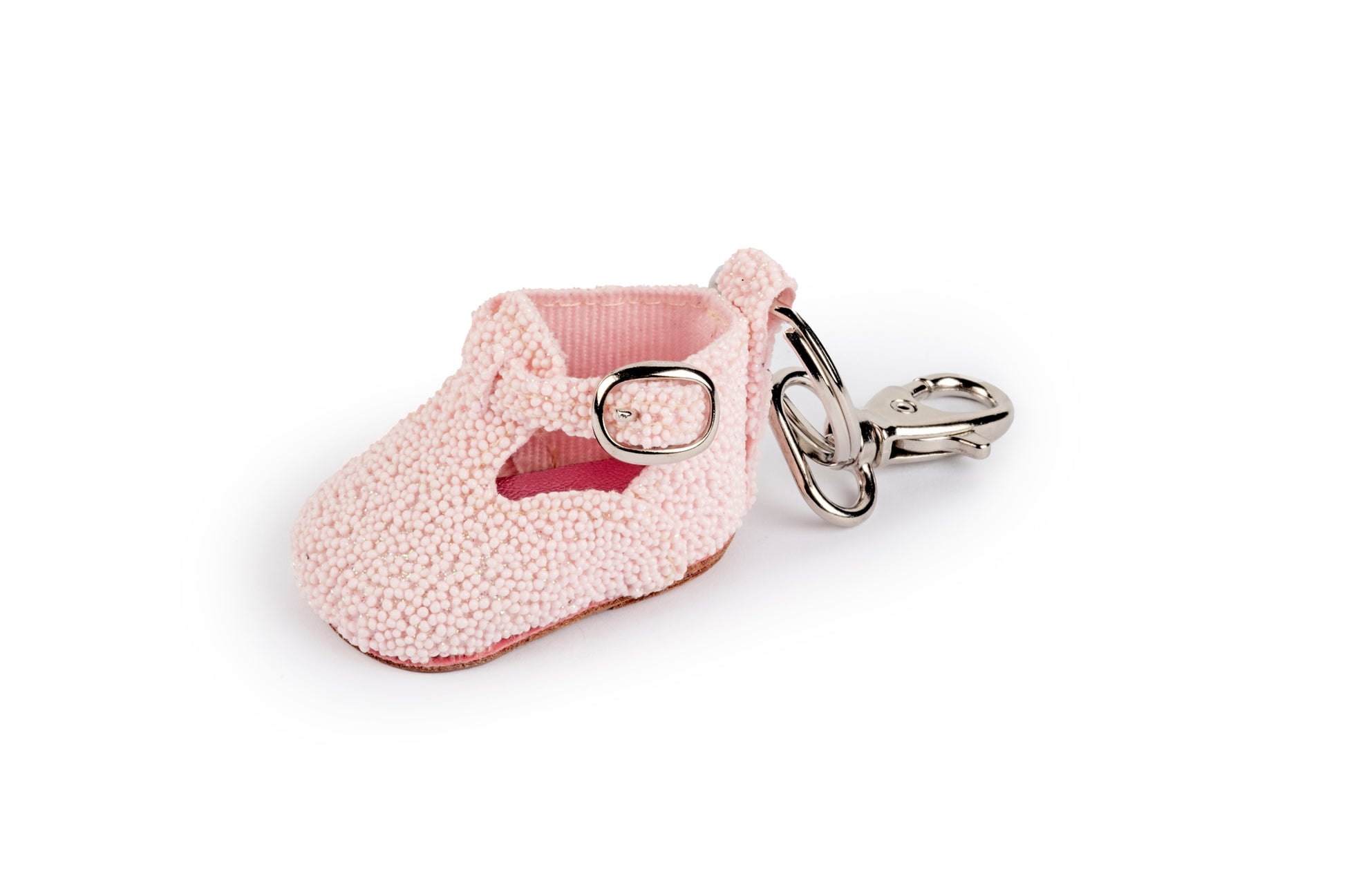 Portachiavi scarpina bebè in tessuto "mosaico" di colore rosa pastello.