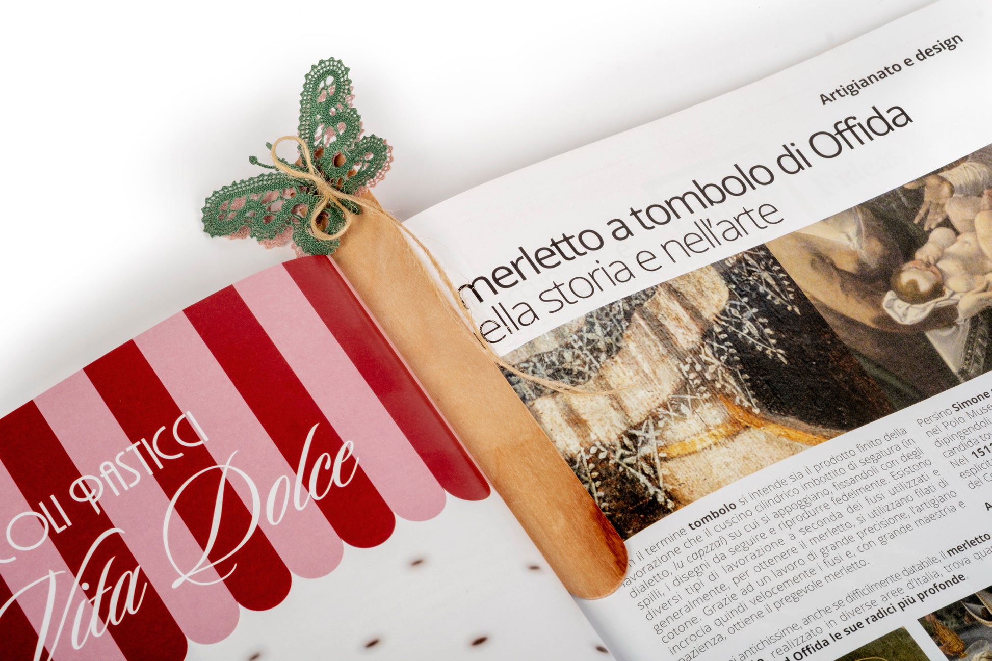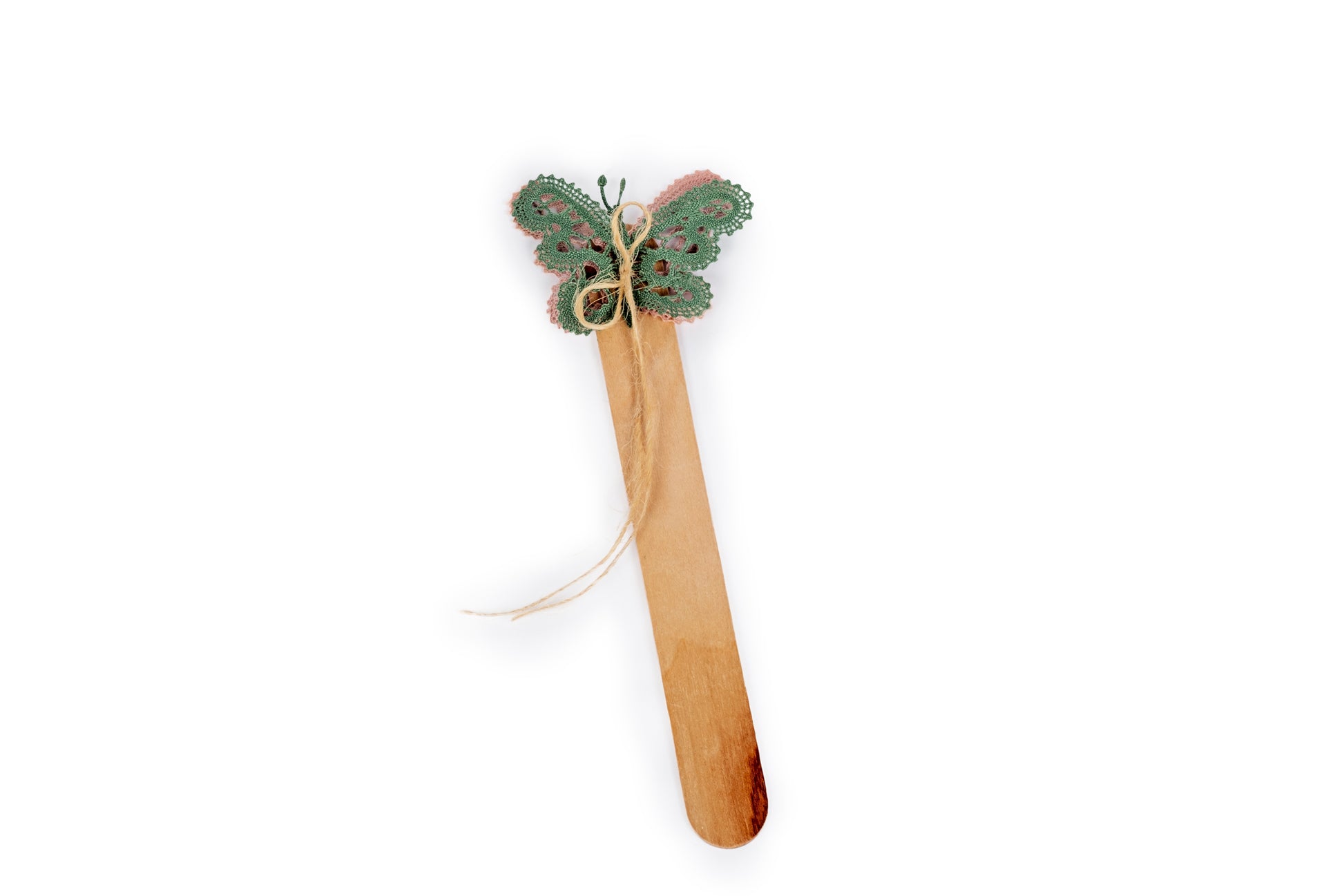 Segnalibro, bomboniera, segnaposto, con doppia farfallina in merletto a tombolo colori verde salvia e rosa.